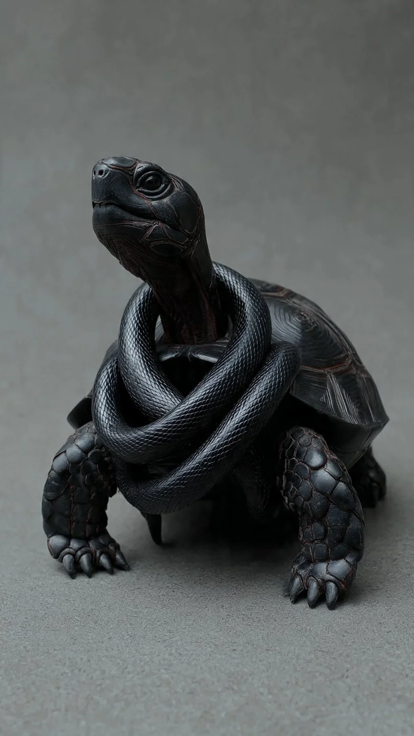 Tortoises were ancient symbols of longevity. Their long lifespan and hard shells made them associated with endurance, divine power, and protection. The serpent coiled around the tortoise adds the symbolism of renewal and transformation.